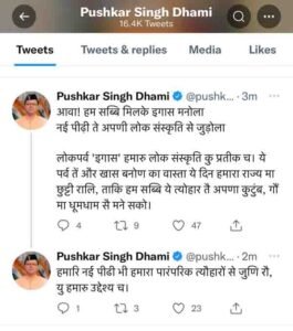 ट्वीट द्वारा यह जानकारी देते हुए मुख्यमंत्री ने कहा कि “आवा! हम सब्बि मिलके इगास मनोला नई पीढ़ी ते अपणी लोक संस्कृति से जुड़ोला। लोकपर्व ‘इगास’ हमारु लोक संस्कृति कु प्रतीक च। ये पर्व तें और खास बनोण का वास्ता ये दिन हमारा राज्य मा छुट्टी रालि, ताकि हम सब्बि ये त्योहार तै अपणा कुटुंब, गौं मा धूमधाम से मने सको । हमारि नई पीढी भी हमारा पारंपरिक त्यौहारों से जुणि रौ, यु हमारु उद्देश्य च।”