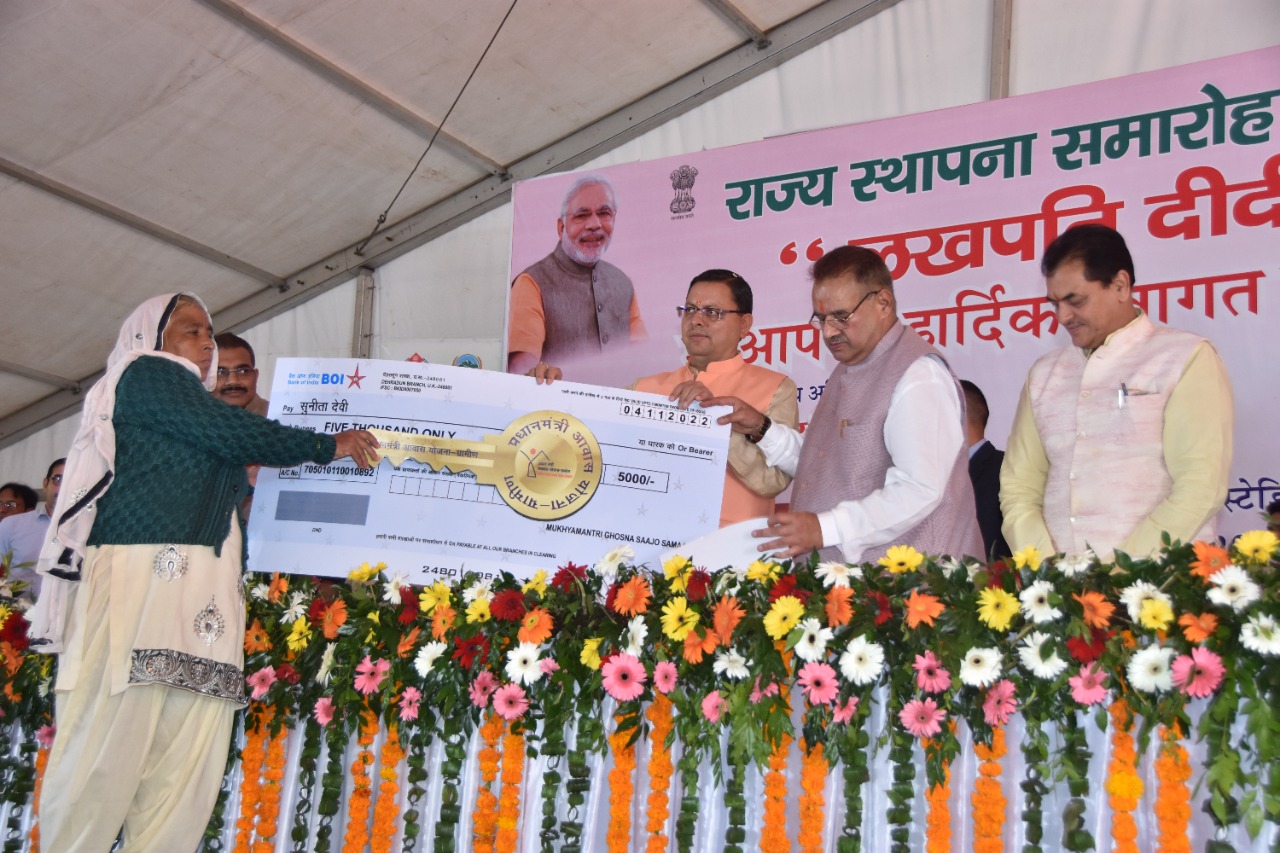 हिम सन्देश, 04 नवंबर 2022, शुक्रवार, देहरादून। मुख्यमंत्री पुष्कर सिंह धामी ने शुक्रवार को सर्वे ऑफ इण्डिया ग्राउण्ड, हाथीबड़कला में आयोजित “लखपति दीदी मेला“ कार्यक्रम में बतौर मुख्य अतिथि प्रतिभाग किया। राज्य स्थापना दिवस के उपलक्ष्य में यह कार्यक्रम ग्राम्य विकास विभाग द्वारा आयोजित किया गया। इस अवसर पर मुख्यमंत्री ने स्वयं सहायता समूह के माध्यम से एक वर्ष में एक लाख रुपए से अधिक की आय अर्जित करने वाली महिलाओं को “लखपति दीदी” के रूप में सम्मानित किया। प्रधानमंत्री आवास योजना ग्रामीण के तहत लाभार्थियों को चेक भी प्रदान किये गये।